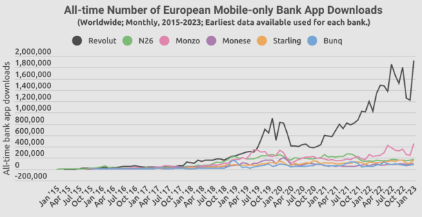 According to SignHouse, the speed with which digital, app-based, and mobile-first banks entice customers is nothing but short of impressive. UK-based Revolut has gone from approximately 1.5 million customers in February 2018 to over 25 million customers in 2022. Take a look at how European mobile-only bank apps downloads have been growing last few years.